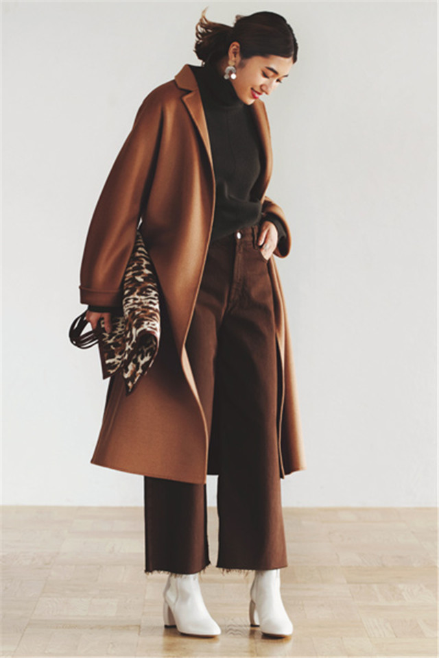 作为布朗风搭配的颜色,说起这个冬天是不可或缺的单品颜色,搭配动物花纹的鞋子。将面积较大的大衣搭配成米色。在长布朗尼色的连衣裙上,穿上长长的羊毛大衣,获得当季的时尚度。